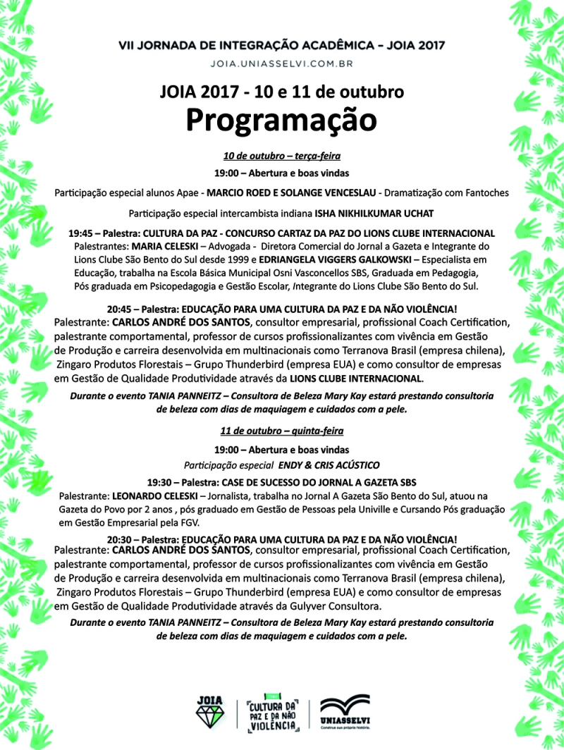 Confira no link: Programação JOIA - São Bento do Sul/SC